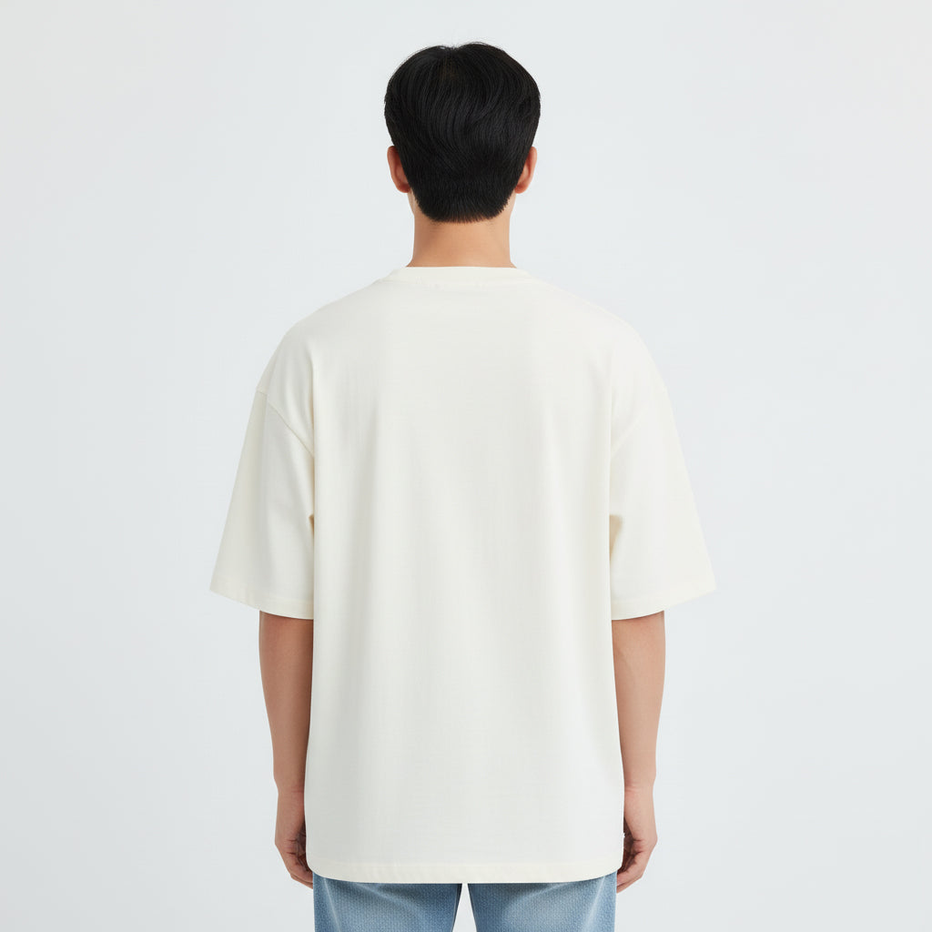 Made from 220 GSM premium cotton, it offers a luxurious hand feel and structured drape, giving that perfect oversized silhouette. The off-white base with teal astronaut detailing adds a bold pop while keeping the look clean and minimal.